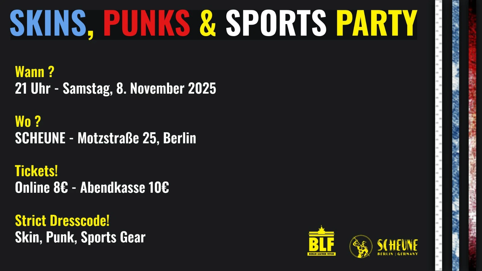 Am Samstag, 8. November 2025 lädt der BLF e.V. zur Skins, Punks & Sports Gear Party in die Scheune, Motzstraße 25 in Schöneberg.